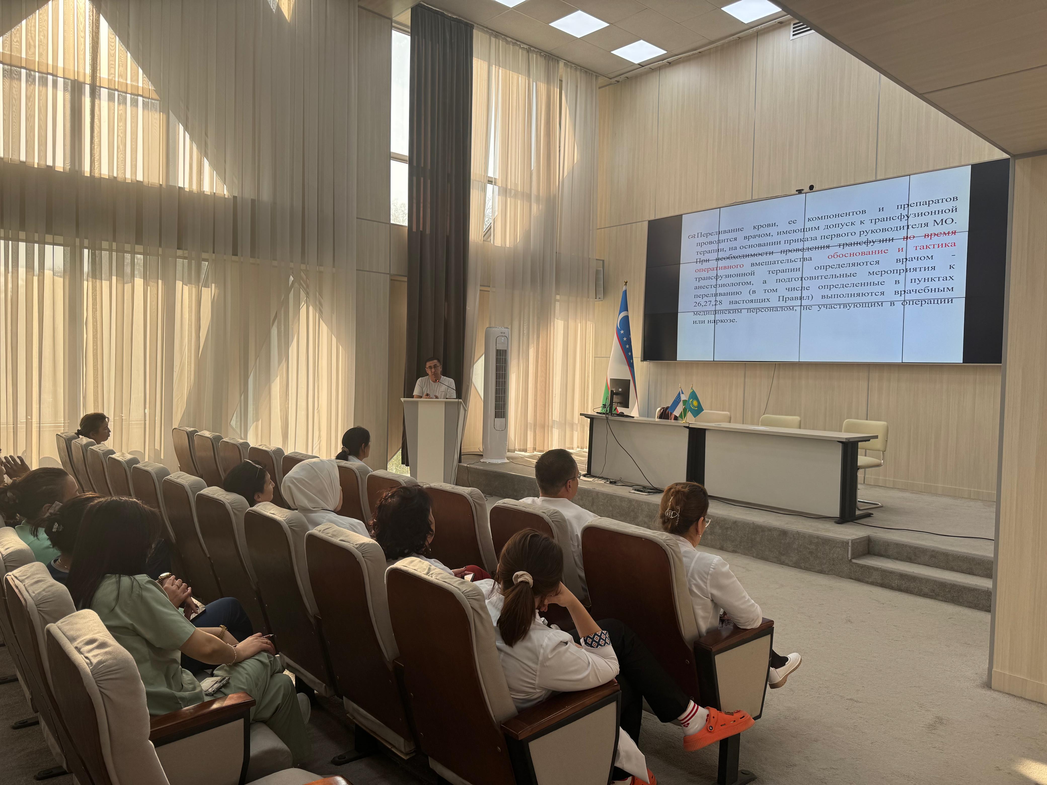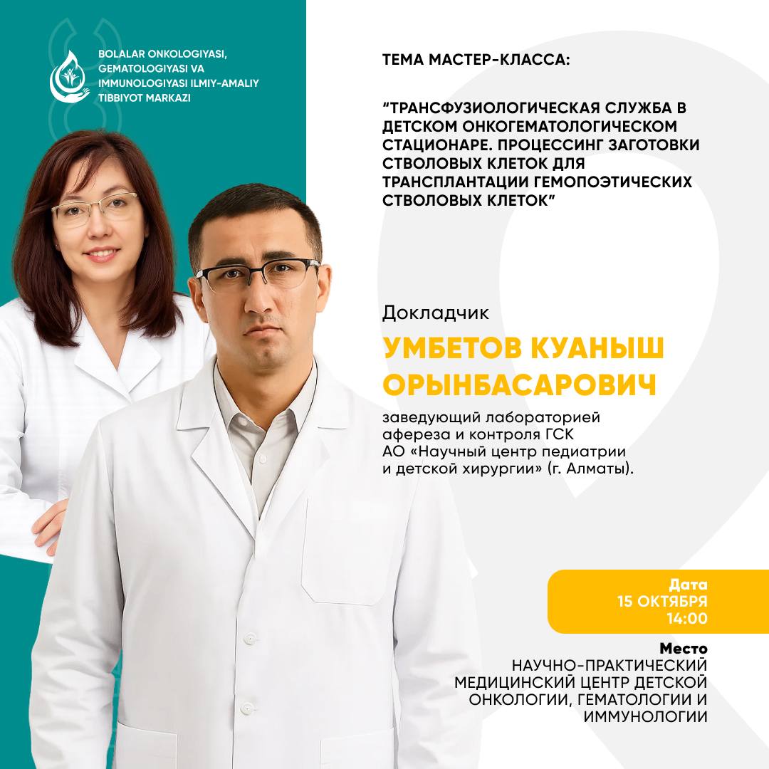 15 октября в г.Ташкент, Научно-практическом центре детской онкологии, гематологии и клинической иммунологии Клинический трансфузиолог НЦПДХ Куаныш Умбетов провел 2 мастер-класса на тему: «Трансфузиологическая служба в детском онкогематологическом стационаре. Процессинг заготовки стволовых клеток для трансплантации гемопоэтических стволовых клеток», а также по лечебному плазмоферезу у детей с онкогематологическими заболеваниями.