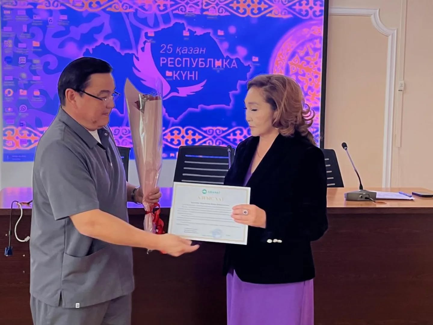 Кроме того, в ходе торжественного собрания Благодарственными письмами от партии «AMANAT» были награждены эпидемиолог Центра Жанна Тынысбекова, детский хирург Молдир Калабаева, экономист Динара Скакова, заведующий отделением лучевой диагностики Сундет Саргелов и медсестра онкологического отделения №1 Аккенже Койшыбаева.