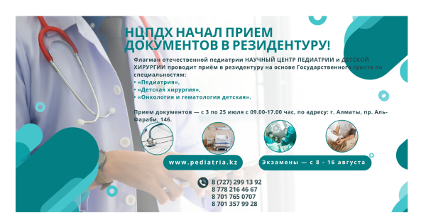 Вниманию выпускников медицинских ВУЗов и молодых врачей! АО «Научный центр педиатрии и детской хирургии» объявляет конкурсный приём по обучению в Резидентуре на основе Государственного образовательного заказа на подготовку медицинских кадров в Резидентуре на 2025-2026 учебный год.