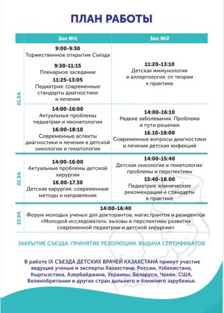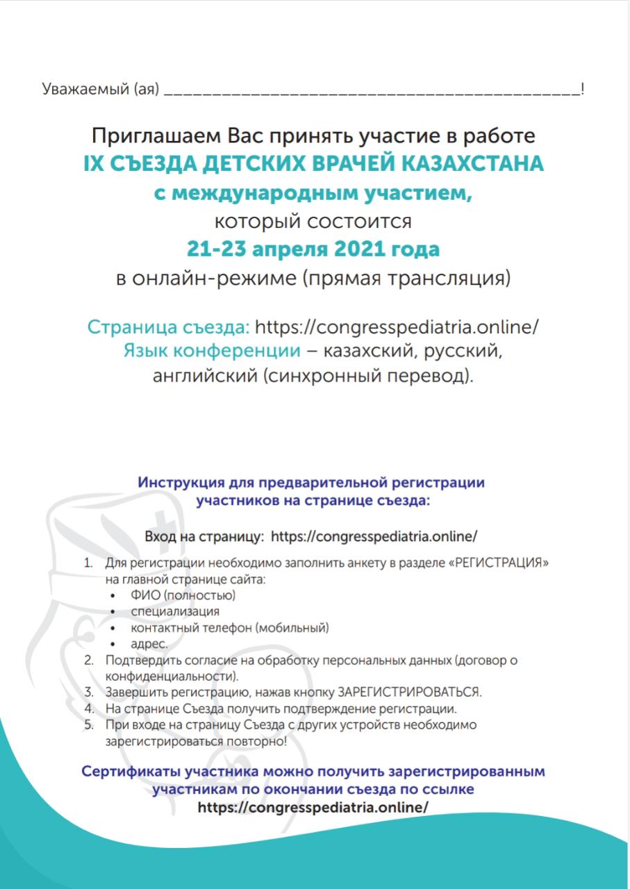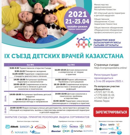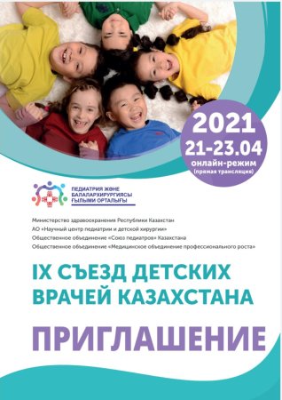 Dear colleagues, we invite you to take part in the IX Congress of Pediatricians of Kazakhstan, which will be held on April 21-23, 2021 online (live broadcast) from 09.00 to 18.10.