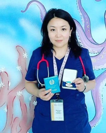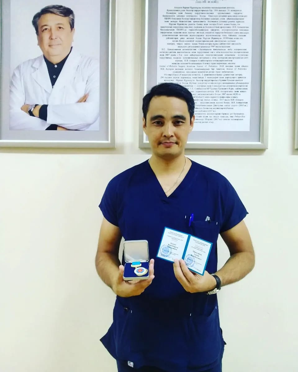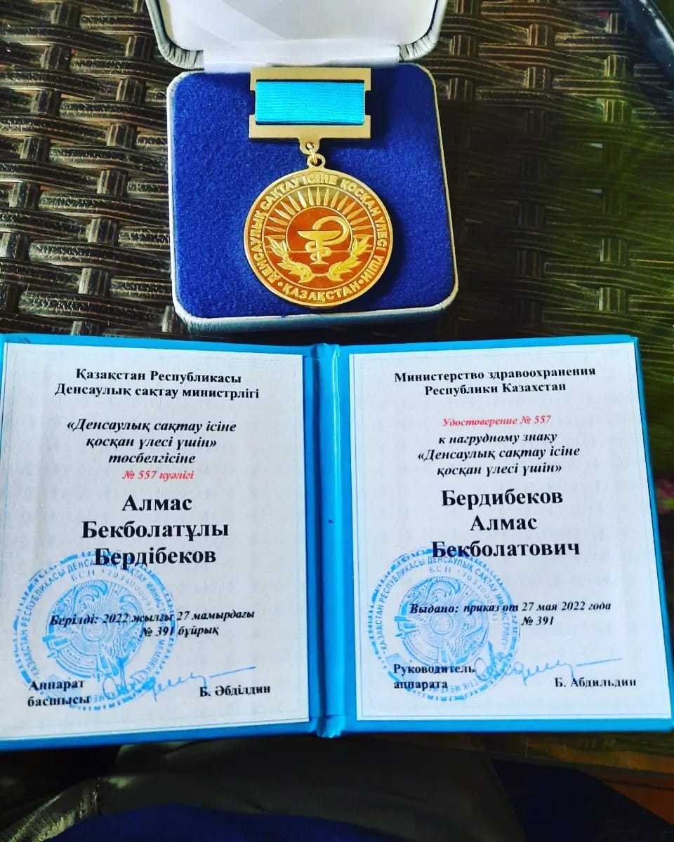 Badge of the Ministry of Health of the Republic of Kazakhstan "Densaulyk saktau іsіne koskan үlesі үshin" was awarded to: nurse of the department of neonatology and neonatal surgery - Bakytkul Kundyzbayeva, senior nurse of the urology department - Botazhan Abdrasylova, radiologist of the radiology department - Amankul Tainekova, cardiac surgeon, head of the department of cardiac surgery , interventional cardiology and angiosurgery - Almas Berdibekov.
