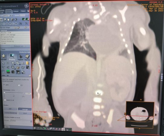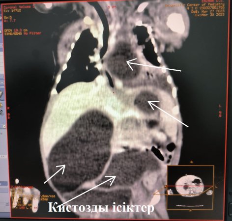 A huge cyst occupied the entire left chest, with compression of the left lung, the child had symptoms of respiratory failure from birth. Also, there were cystic formations in the abdominal cavity, as a result, the stomach was enlarged in volume, creating increased pressure in the abdominal cavity, with impaired stool discharge.