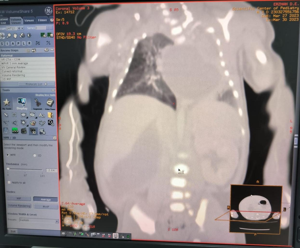 The child was transferred from the Central District Hospital of Talgar on the second day of life to the Scientific Center of Pediatrics and Pediatric Surgery. The diagnosis was established prenatally by ultrasound of the fetus.