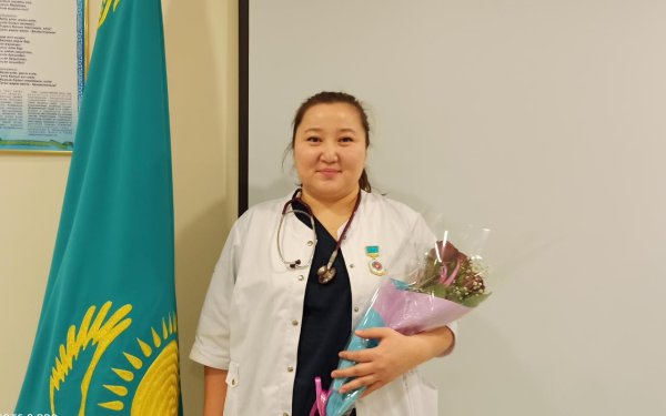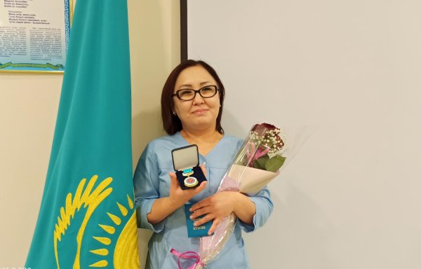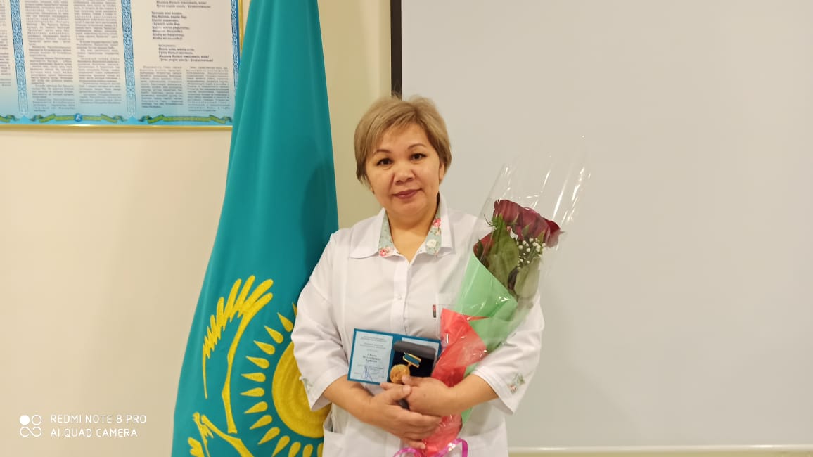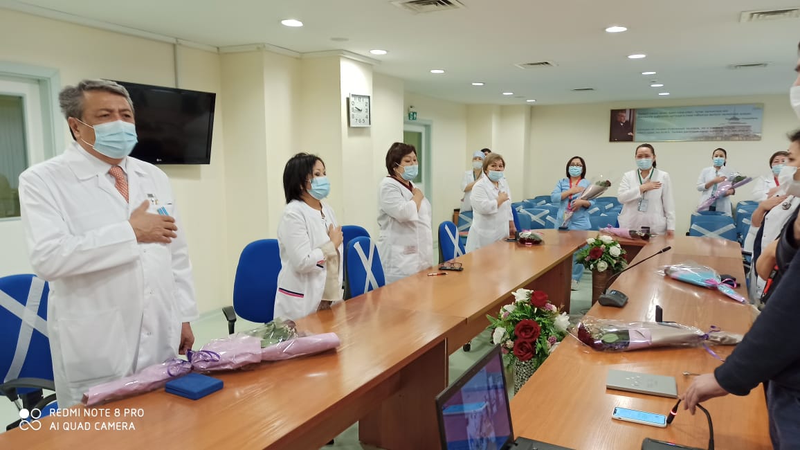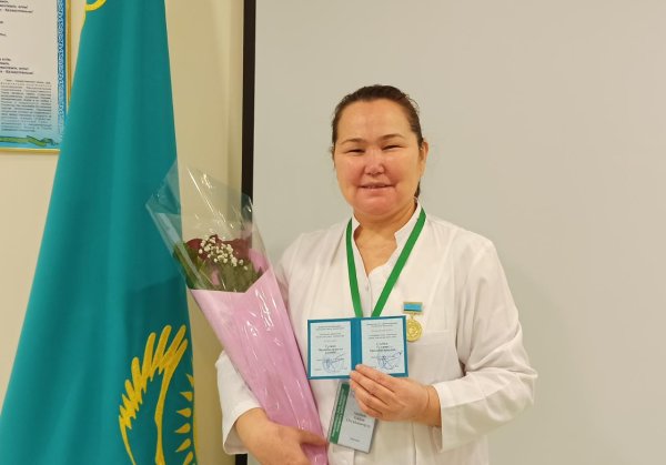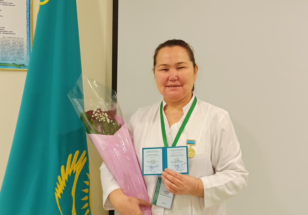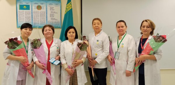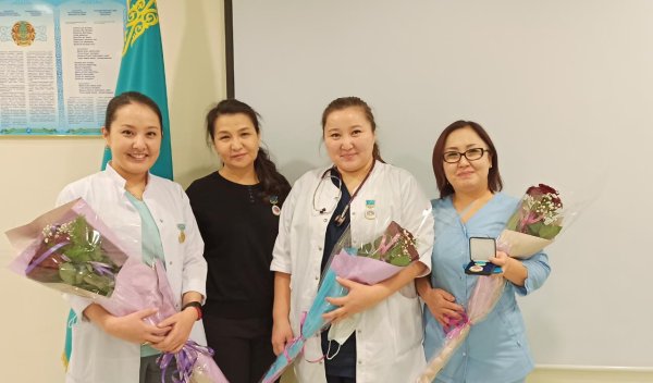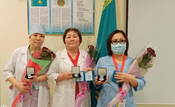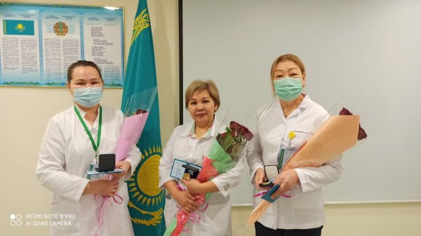 Нагрудным значком «Денсаулық сақтау ісіне қосқан үлесі үшін» награждены заведующий отделением лучевой диагностики Сундет Саргелов, специалист лаборатории Айзада Аринова, старшая медсестра оперблока Камилям Маметбугенова, медсестра отделения неонатологии Гулжан Садибек,.