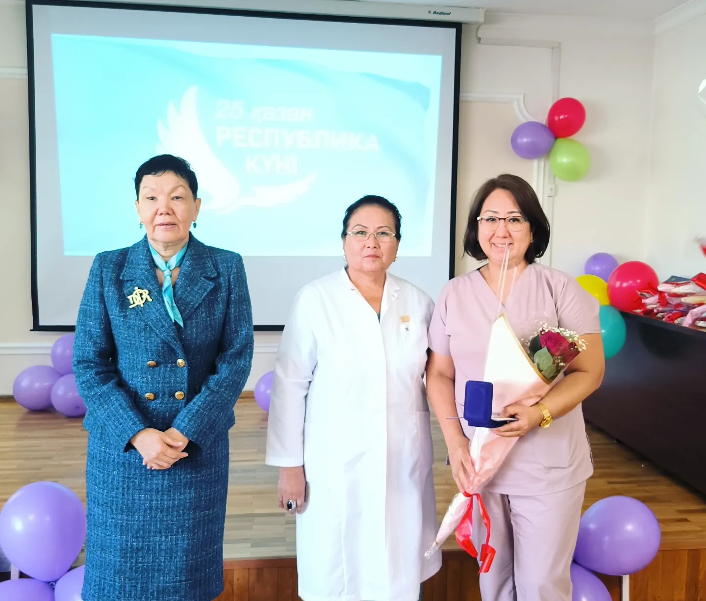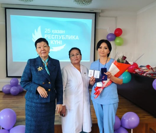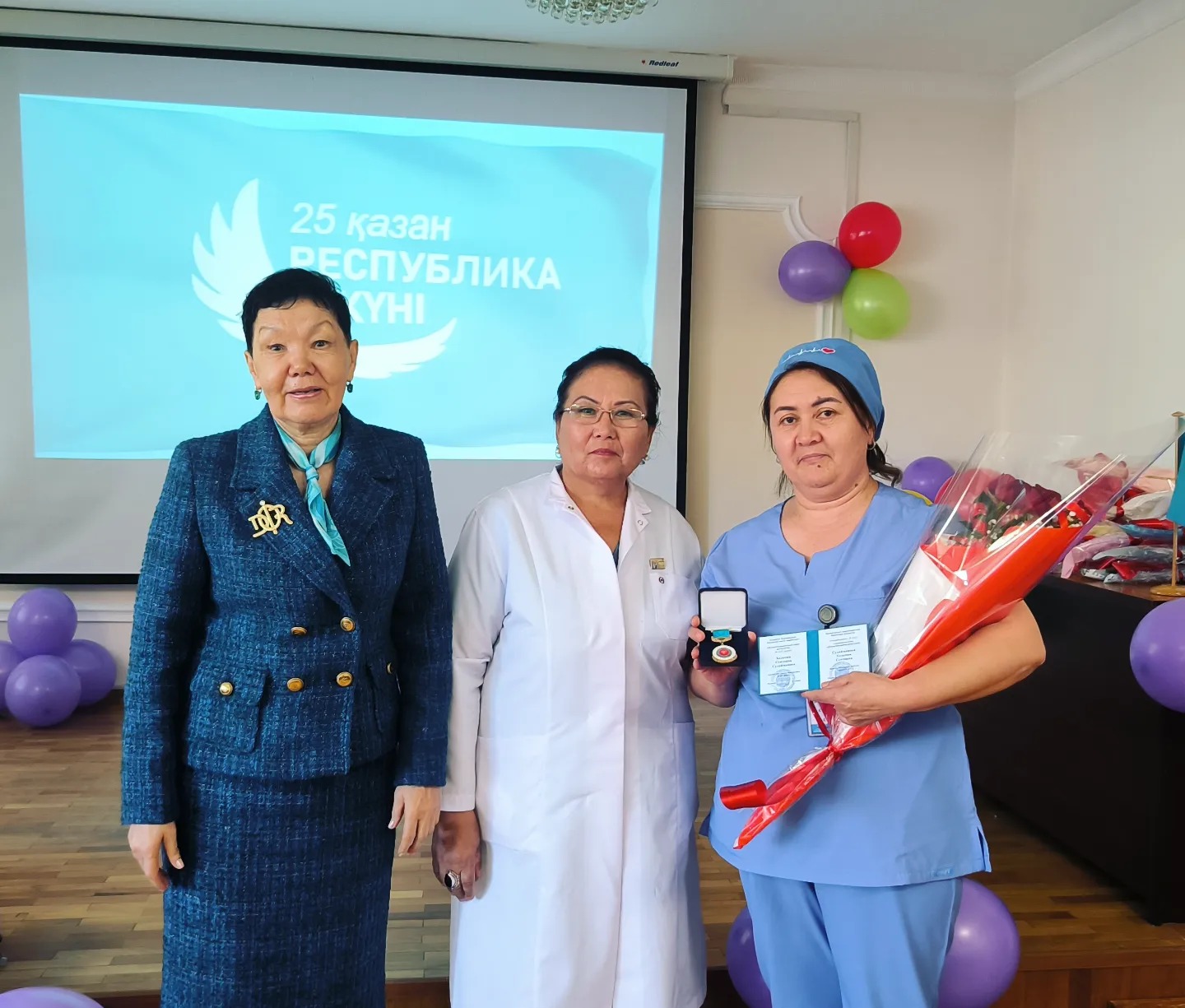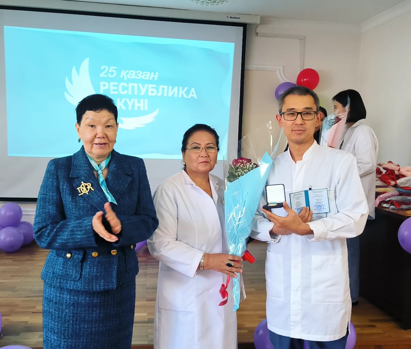 Нагрудным знаком Министерства здравоохранения РК «Денсаулық сақтау ісіне қосқан үлесі үшін» награждены: врач отделения лучевой диагностики Данияр Булатов, библиотекарь Кызгалдак Какимова, медсестра Кумискул Дуйсенбекова, медсестра Айгуль Тлешева.