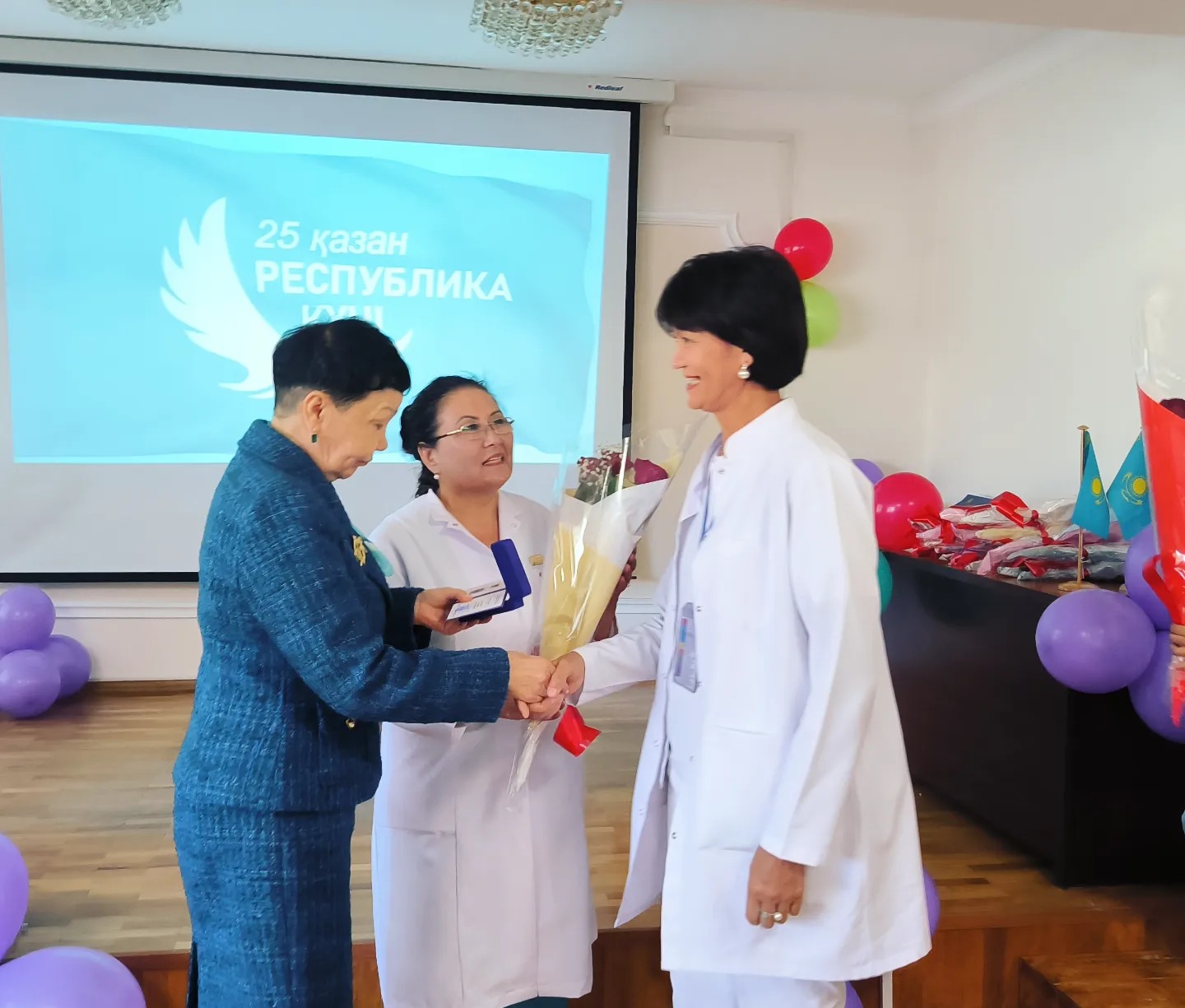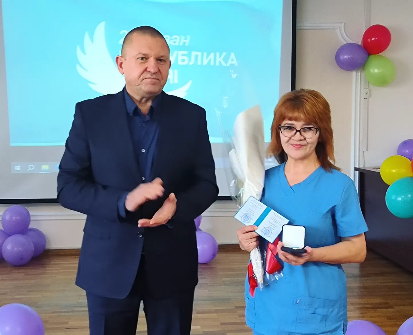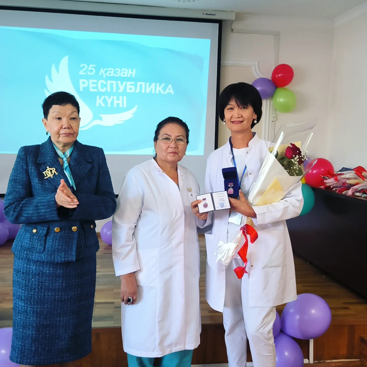 Нагрудным знаком Министерства здравоохранения РК «Денсаулық сақтау ісіне қосқан үлесі үшін» награждены: врач отделения лучевой диагностики Данияр Булатов, библиотекарь Кызгалдак Какимова, медсестра Кумискул Дуйсенбекова, медсестра Айгуль Тлешева.