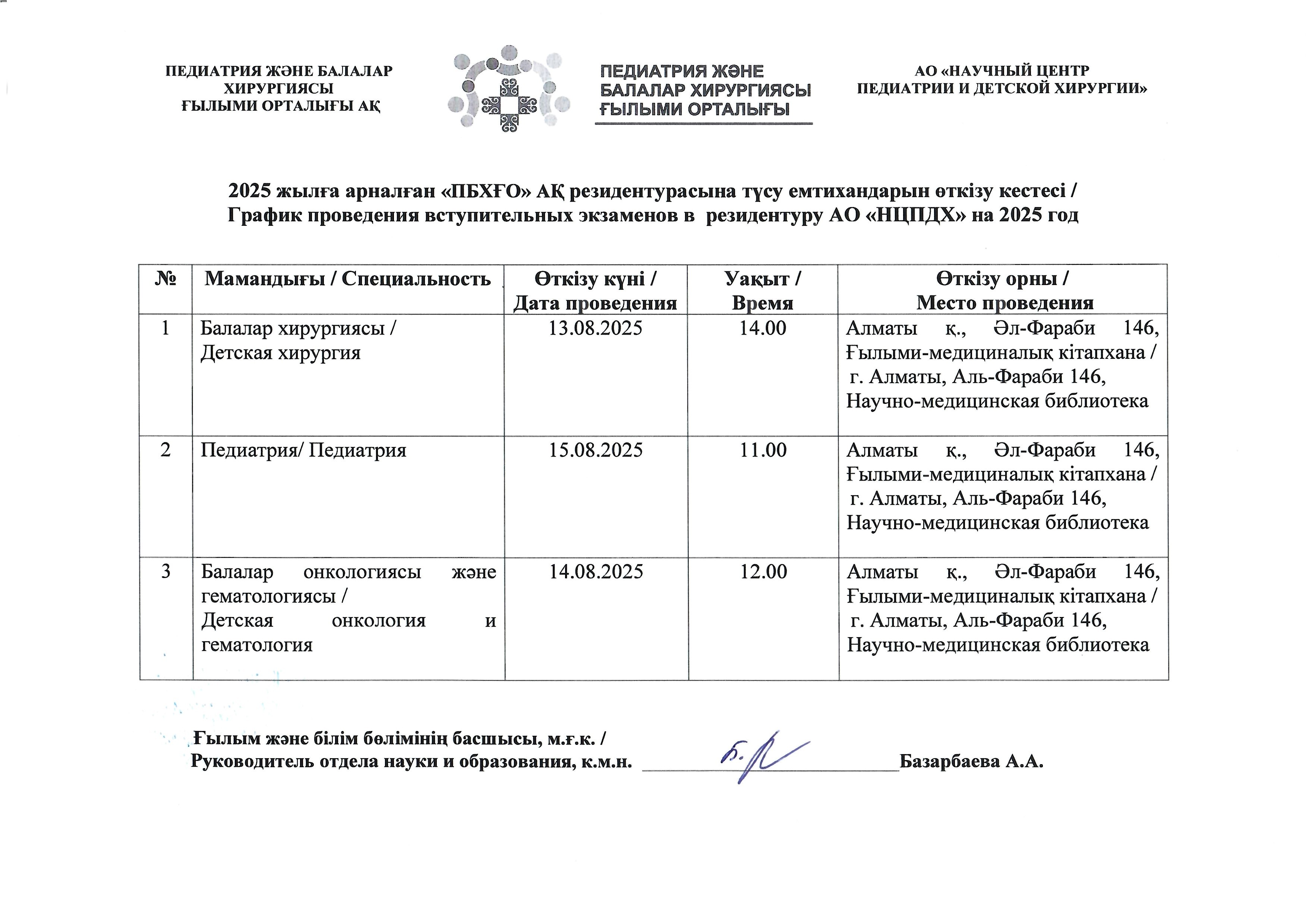 АО «Научный центр педиатрии и детской хирургии» объявляет конкурсный приём по обучению в резидентуре на основе Государственного образовательного заказа, а также на платной основе на подготовку медицинских кадров в резидентуре на 2024-2025 учебный год по следующим специальностям: